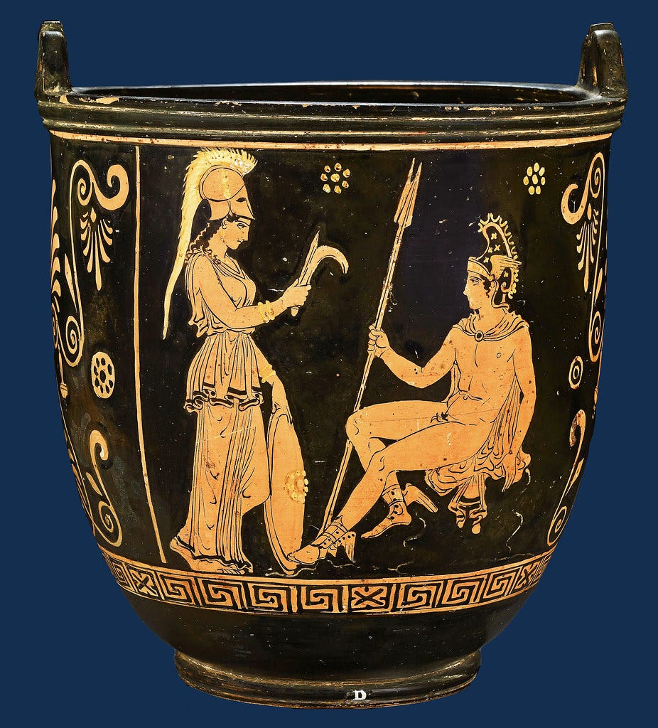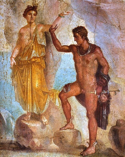 Via the BladesmithsForum, we see a series of depictions of this theme on a group of wall paintings from Pompeii and Stabiae.