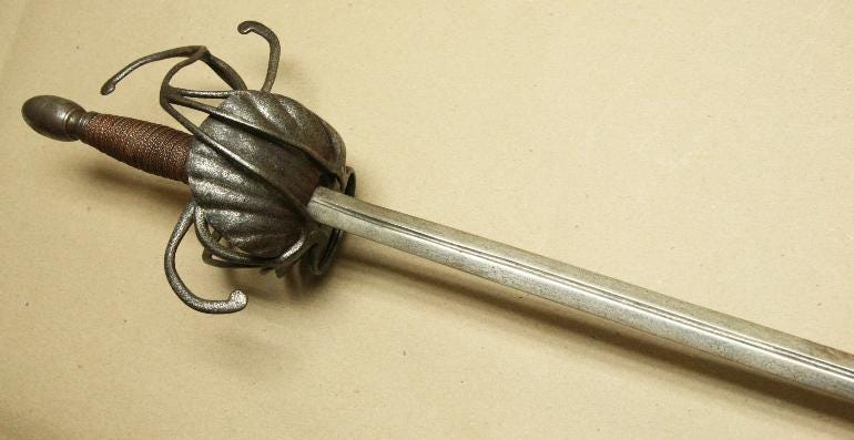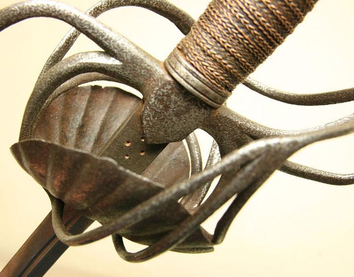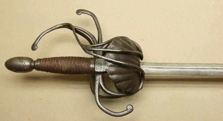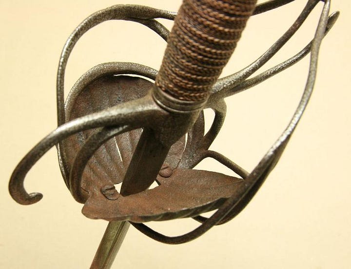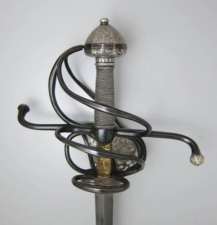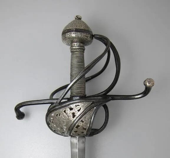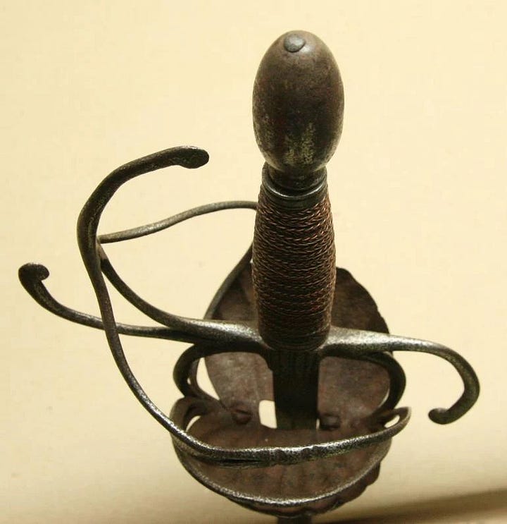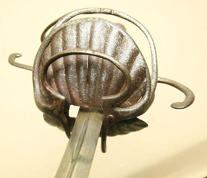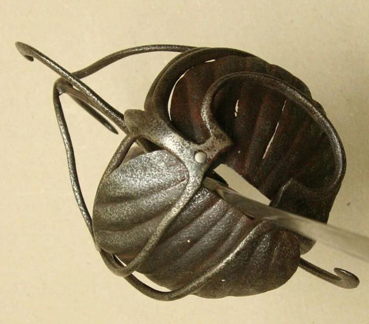Or so I would have thought before I saw the earliest attempts to close the gaps in swept hilts. They just took a classic three-ring swept-hilt rapier and added shell plates on the inside. Next, I am looking at some examples.