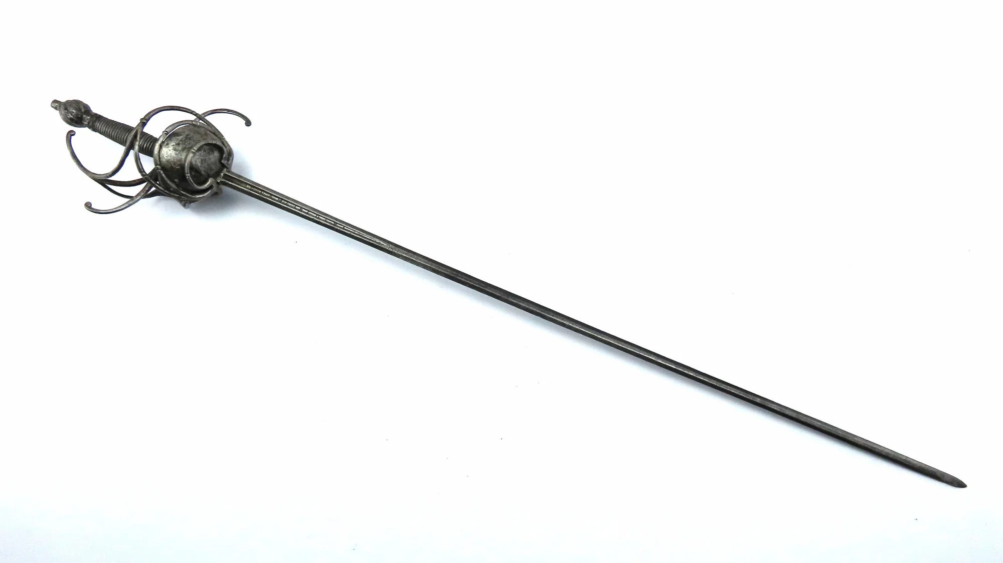 An Italian Swept Hilt Rapier. 46” overall, 37 ½” slender Toledo made blade of stiff diamond section stamped 'Francisco Ruiz' in the single fuller at the forte and ‘IN TE DOMINE SPERAVI’ [In thee, O Lord I Have Placed MY Hope]. Swept hilt comprising a pair of round stell shell guards, with outer guard of three rings, inner guard formed of four swept round bars, ‘S’ shaped diagonally curved long quillons & joined to the knuckle guard by an additional bar. Spirally fluted ovoid pommel, fine wire bound spirally fluted grip with Turk's heads.
