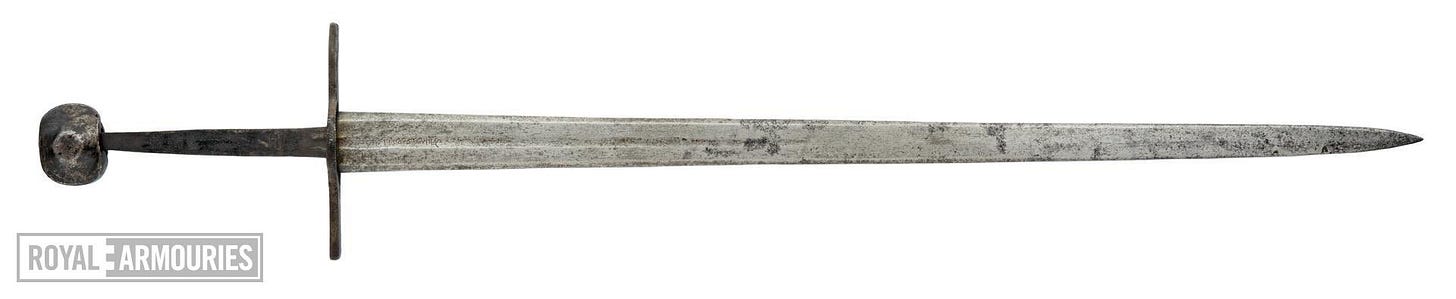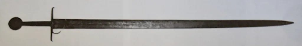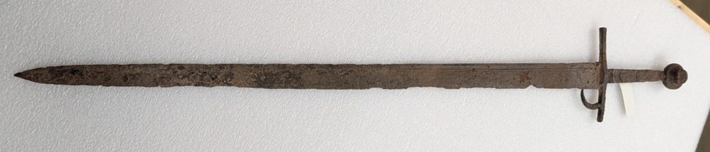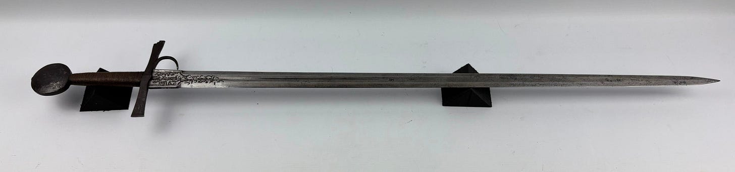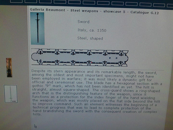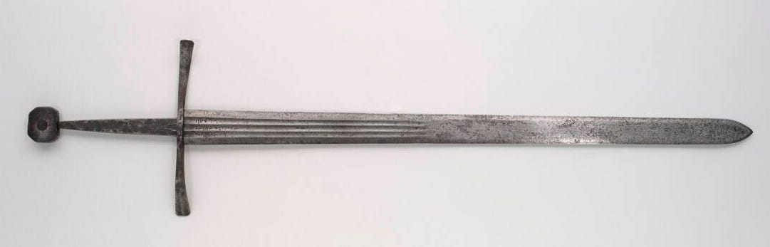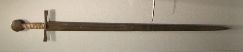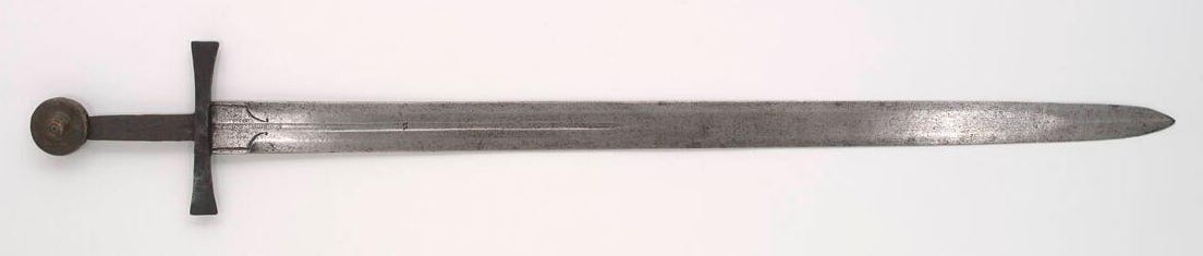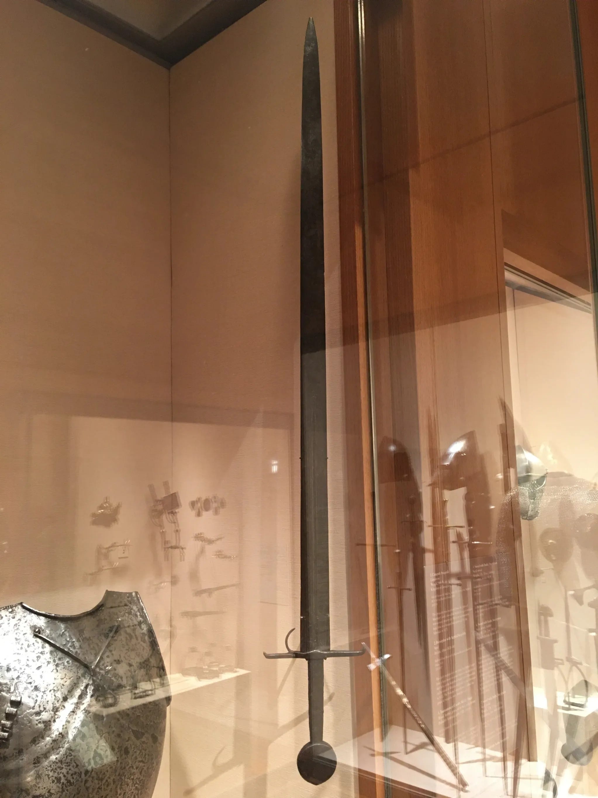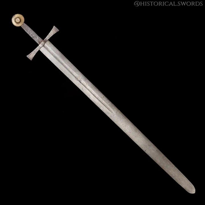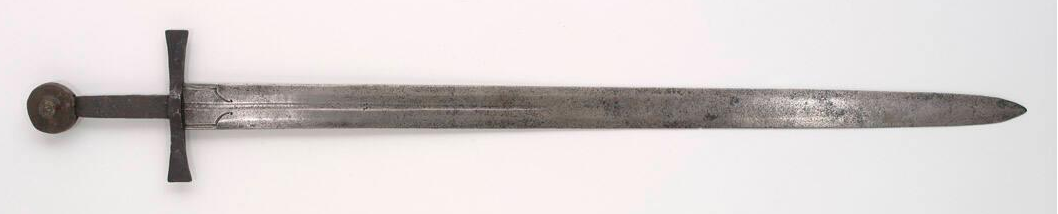 I’ll end with this Italian piece from the later part of the 1300s. With a 92.5cm long blade and at 115.7cm overall length, this is a longsword with an acute tip profile.