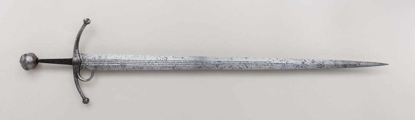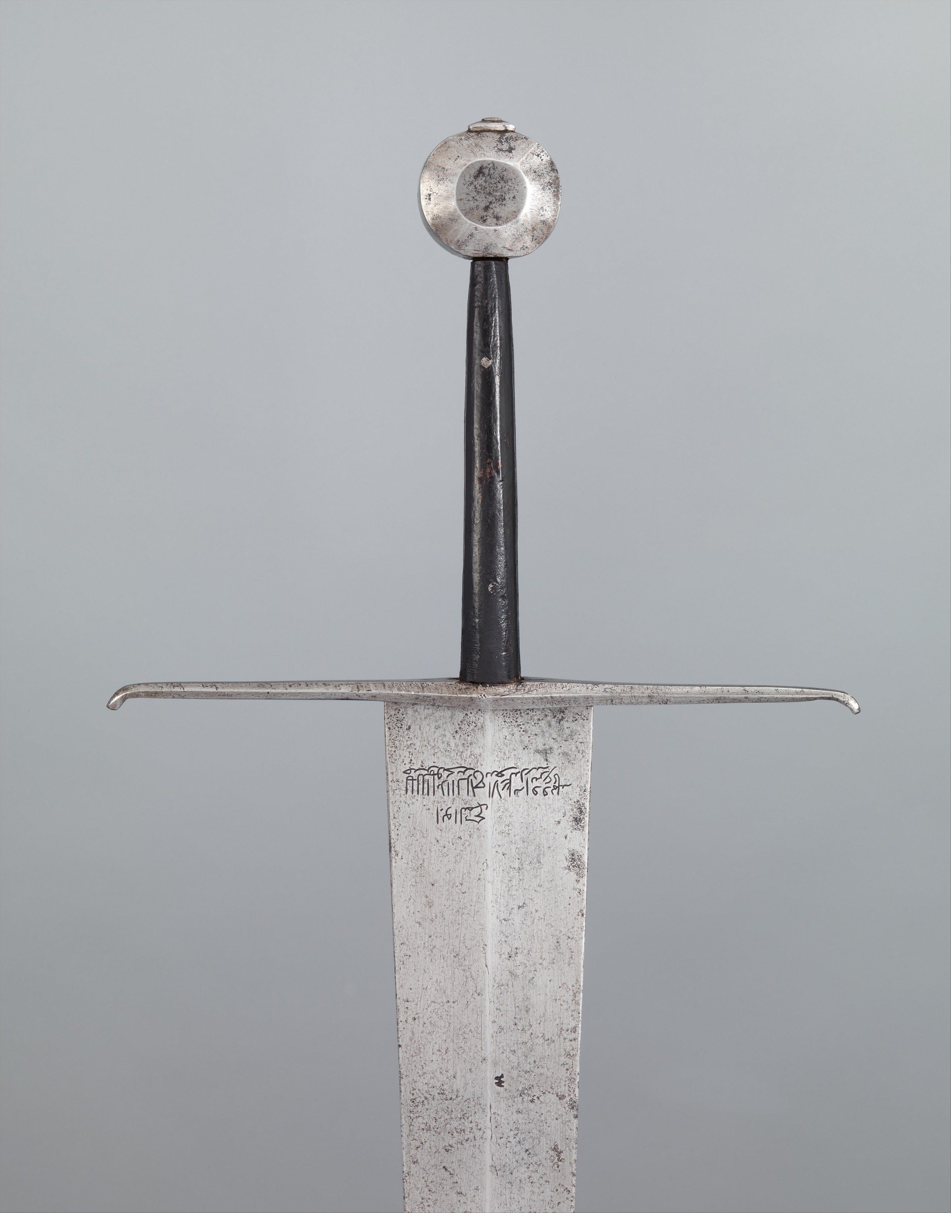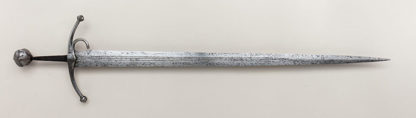 A French sword, c.1500, held in The Met. The style is quite late for a sword from the 1500s. I find it interesting that someone chose this style of hilt so late, when more and more complex hilts were emerging.