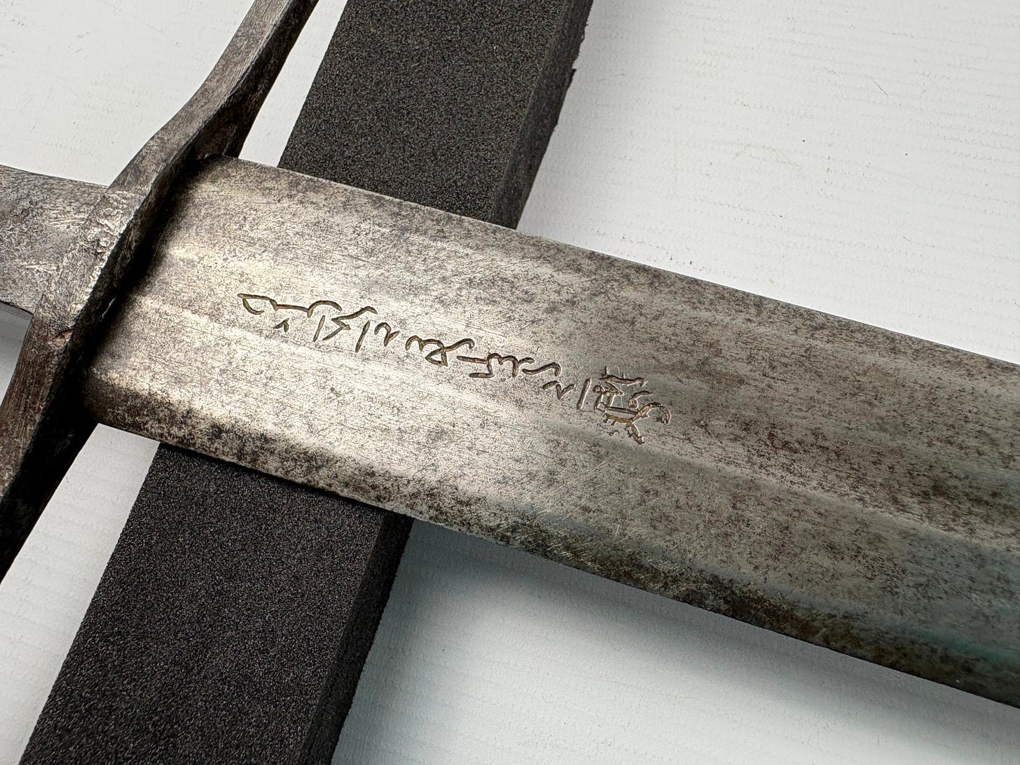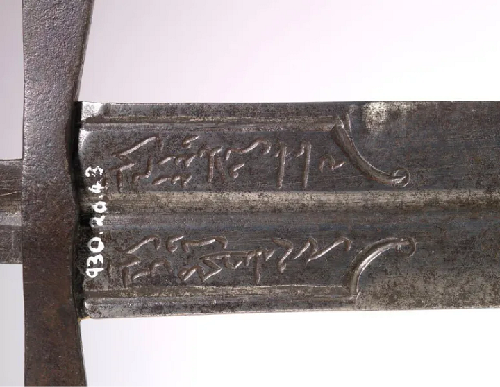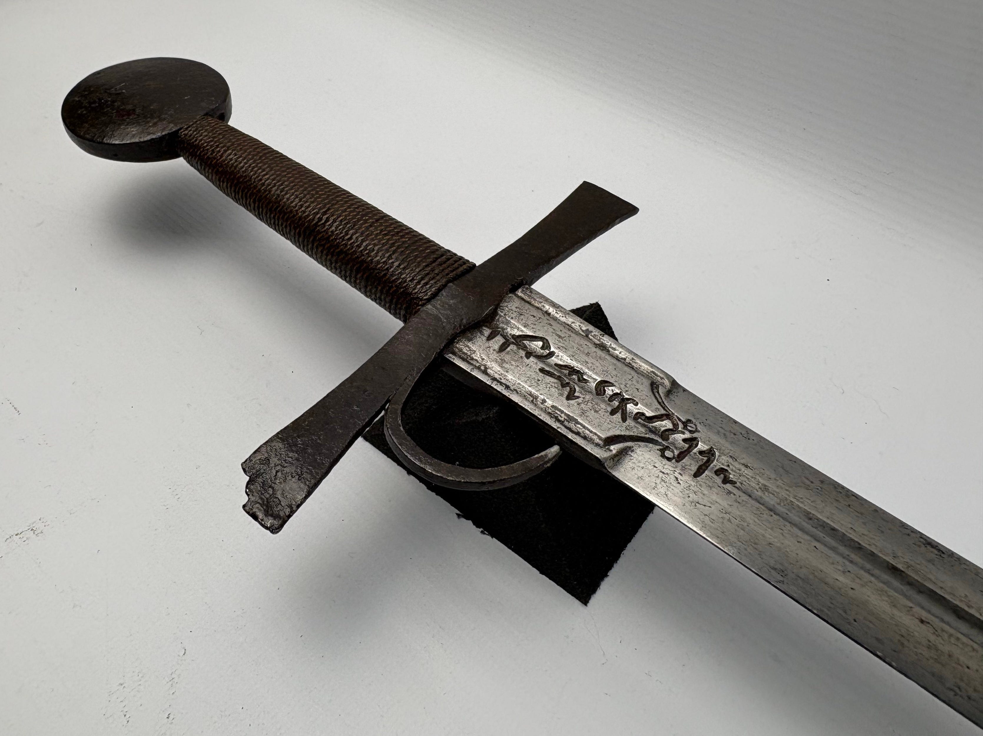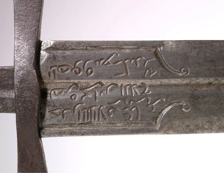 Single-edged blade with a back edge towards the tip, slightly widening at the third quarter, fuller along the back on both sides. Fragment of an inscription on one side of the blade consisting of five illegible stamped letters and symbols. Flat straight quillons widening at the ends, with a small ring.