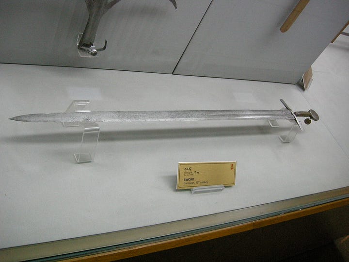 Via a Flickr photo album by Carl Koppeschaar (have a look at many more), we have some clear pictures of other swords from the Arsenal of Alexandria held in Istanbul. Some look like the single finger-ring hilt one-handed swords shown before.
