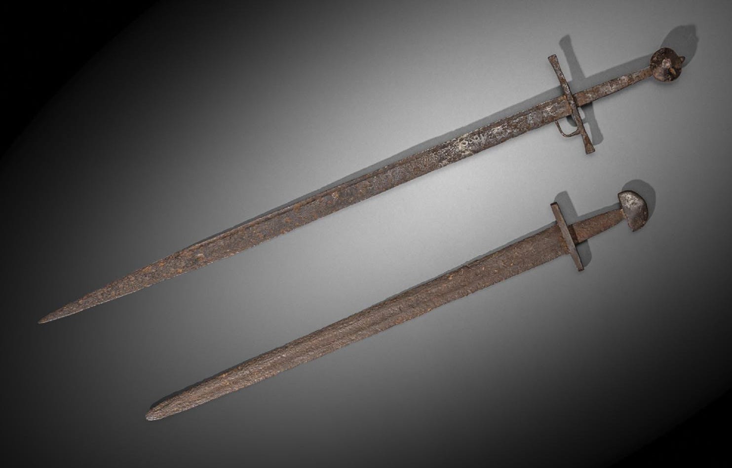 A large two-handed sword, and a longsword with a more acute blade profile that still looks like a decent cutter to me (i.e. not optimised for half-swording).
