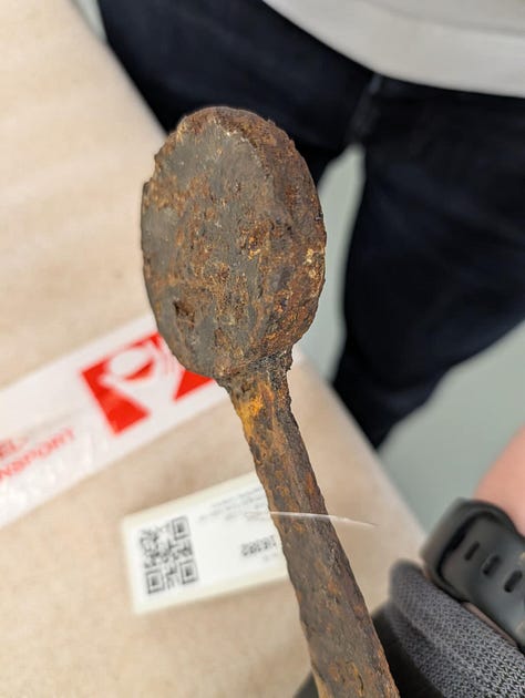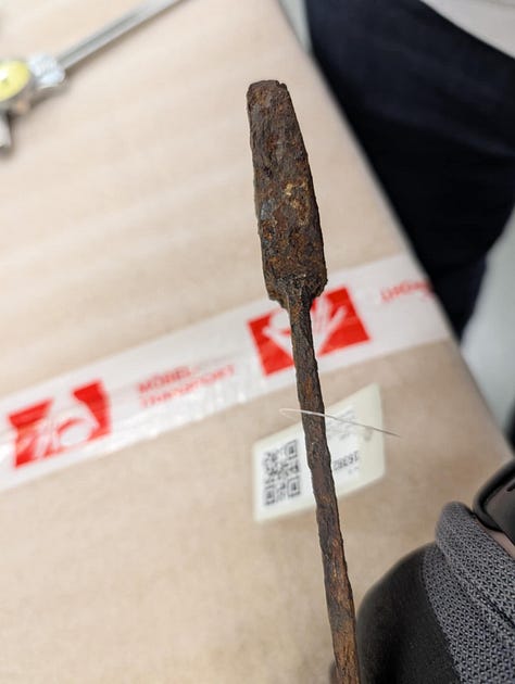 This is not the only piece that looks like this. Via X, this next piece from the 1300s, photographed by the guys at The Spadone Project, is in the SKKG collection. Notice the same backsword-type design. Also, see that the decorative lines (shallow, narrow fullers) are only on one side. This is such a seax type of choice to do on a blade.