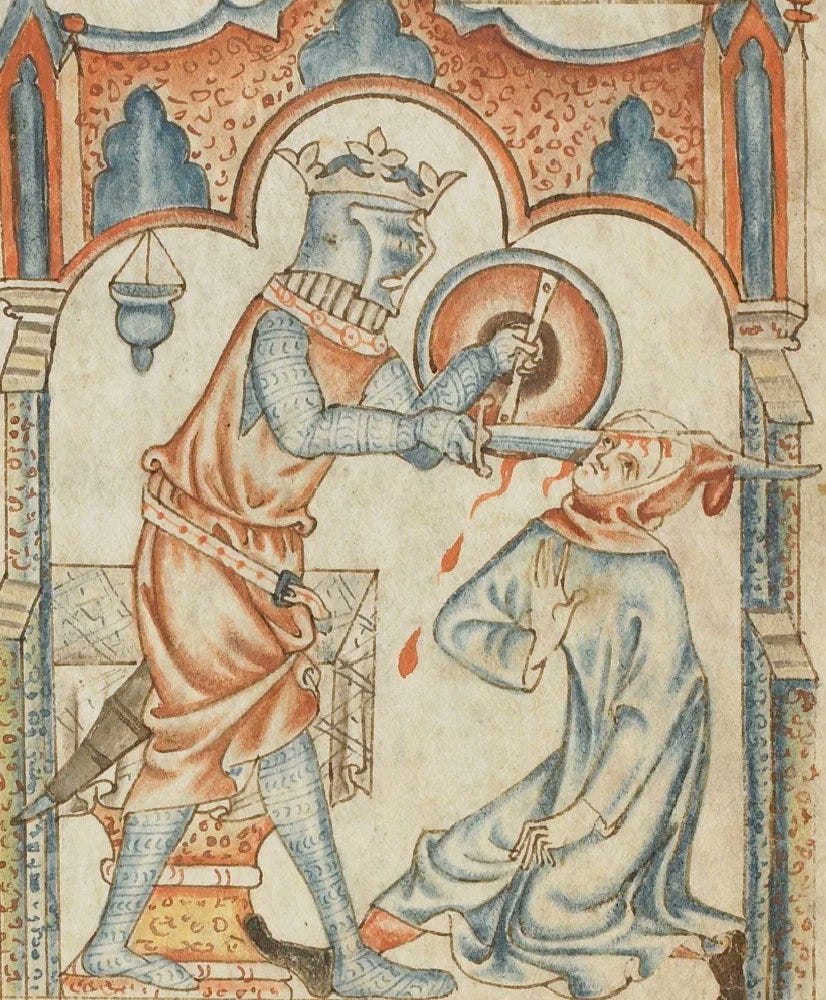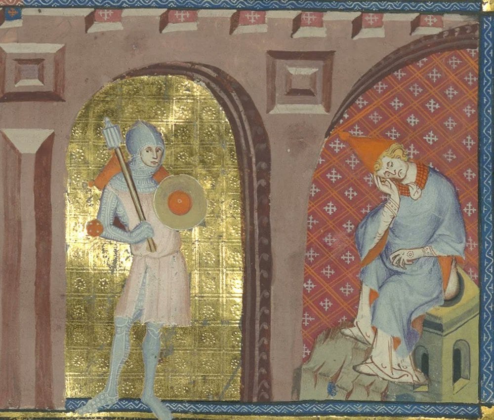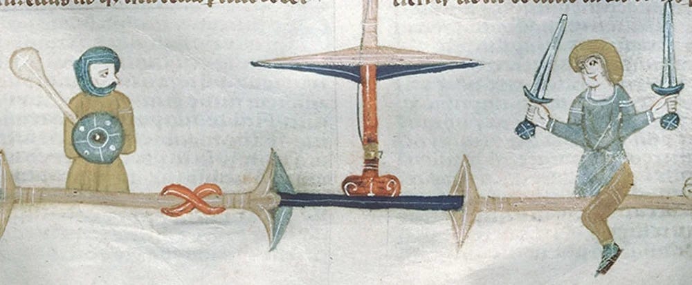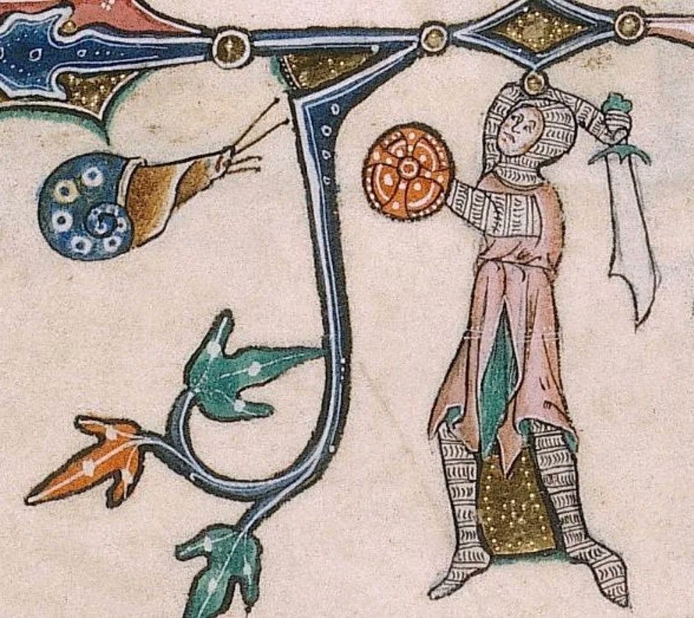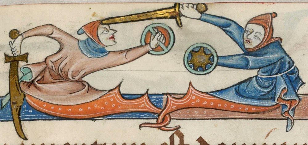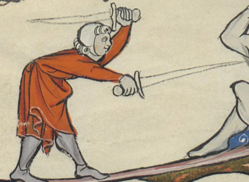 We all have heard of sword and buckler, but usually, we tend to forget about other weapons paired with bucklers, such as axe, bardiche, mace, club, spear, or falchion. We also have the tendency to think of sword and cape as a pairing done with a sidesword or rapier, when in fact we have traces of it from much earlier. I want to show some early art illustrations of these combinations, before the 1400s. I will not show sword and bucker (except those that snuck in a few mixed depictions), as I want to look at them separately.
