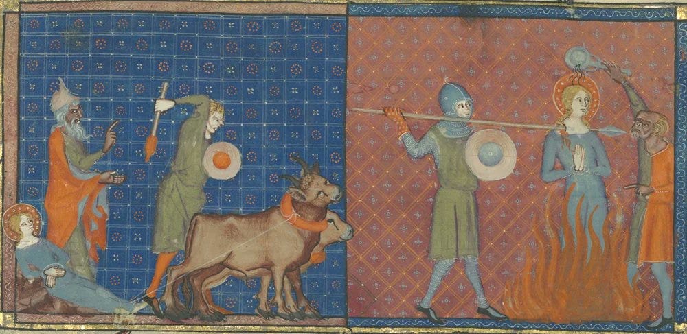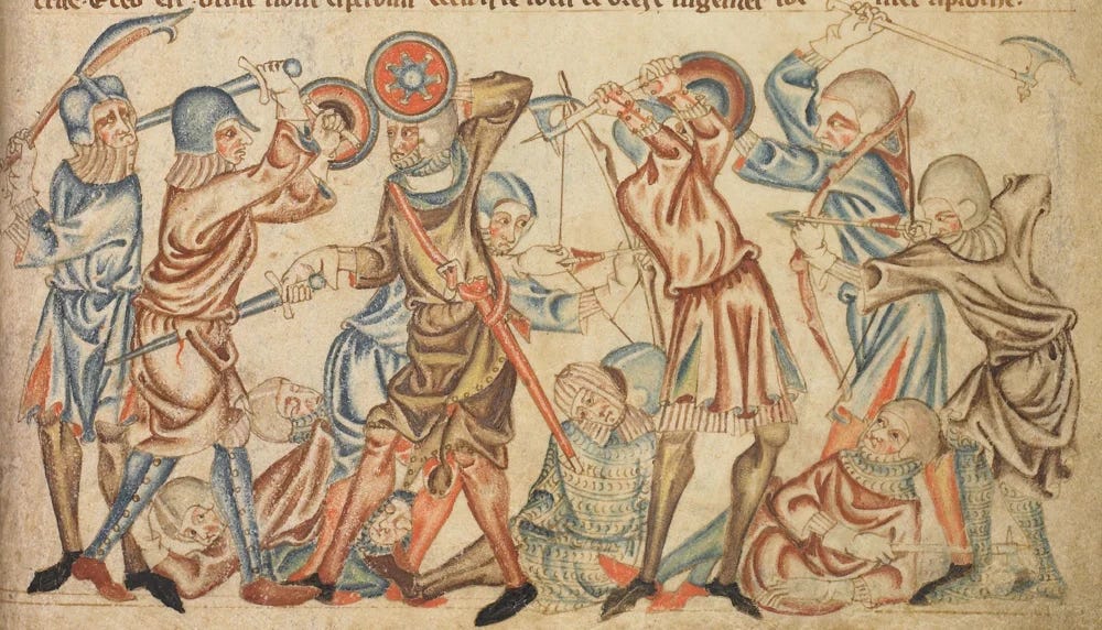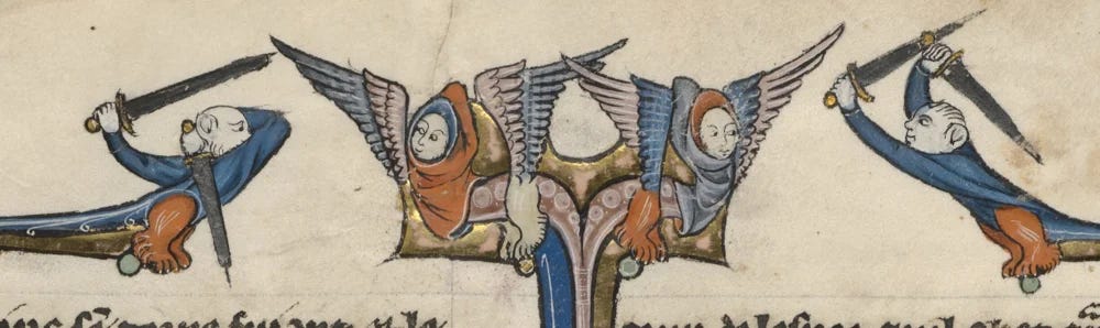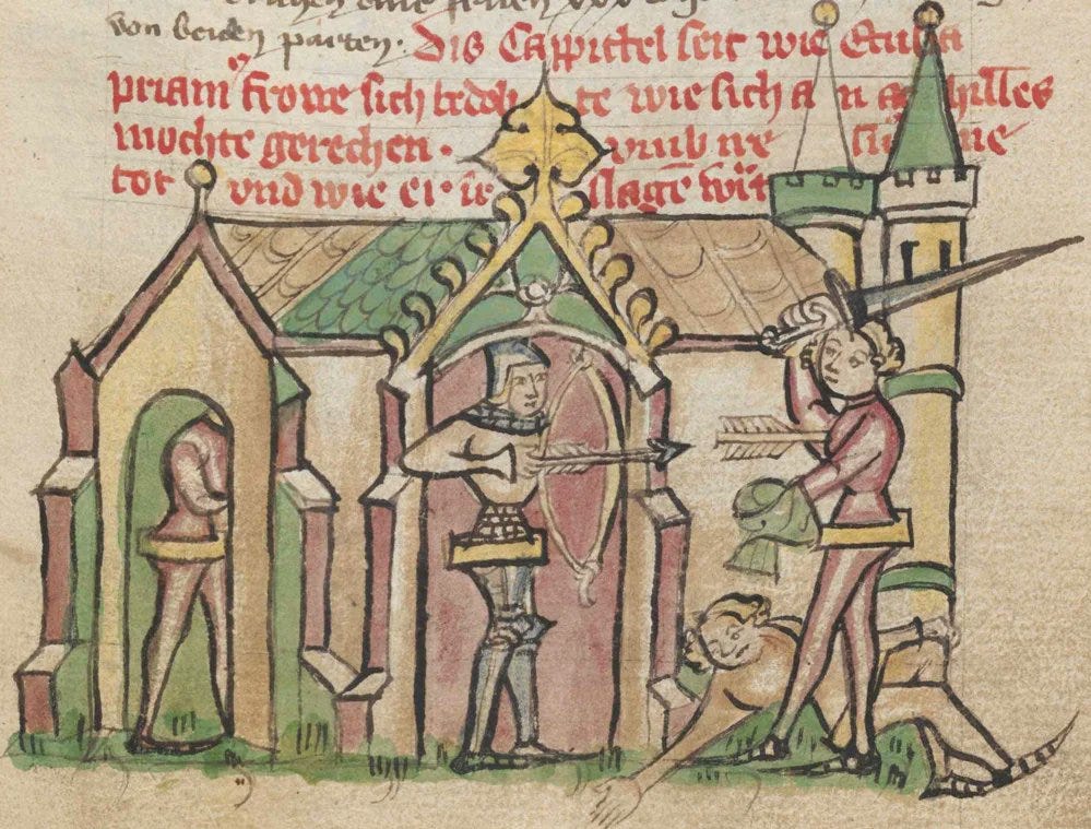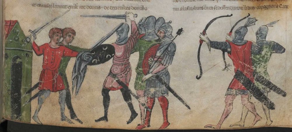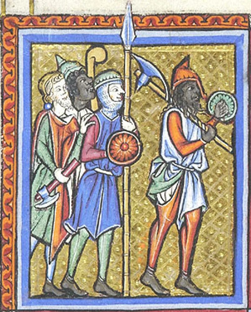 We all have heard of sword and buckler, but usually, we tend to forget about other weapons paired with bucklers, such as axe, bardiche, mace, club, spear, or falchion. We also have the tendency to think of sword and cape as a pairing done with a sidesword or rapier, when in fact we have traces of it from much earlier. I want to show some early art illustrations of these combinations, before the 1400s. I will not show sword and bucker (except those that snuck in a few mixed depictions), as I want to look at them separately.